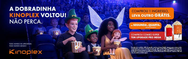 A Dobradinha voltou! A partir de 12 de fevereiro, de SEGUNDA A QUARTA, você compra um ingresso e o segundo é grátis. Isso mesmo, pagou 1 e levou 2 ingressos nos cinemas Kinoplex! E tem mais pipoca para sua diversão: na compra do Combo Super você leva o Combo Mega. Não válida para conteúdos especiais e promocionais, feriados, pontos facultativos, pré-estreias, pré-vendas, salas Platinum e IMAX e UCI Kinoplex.